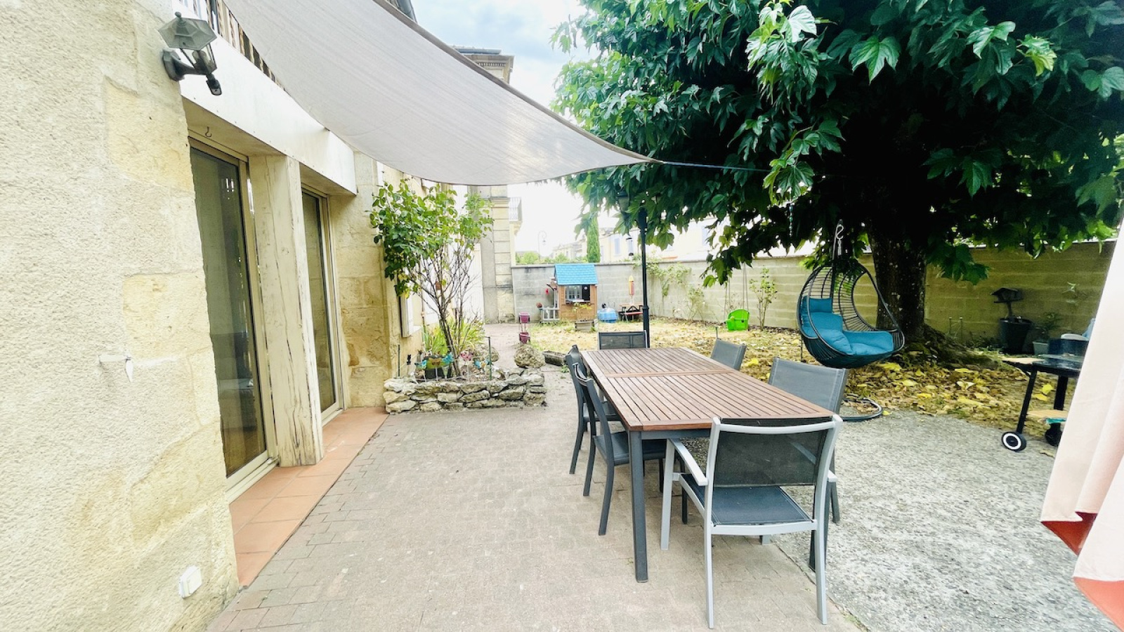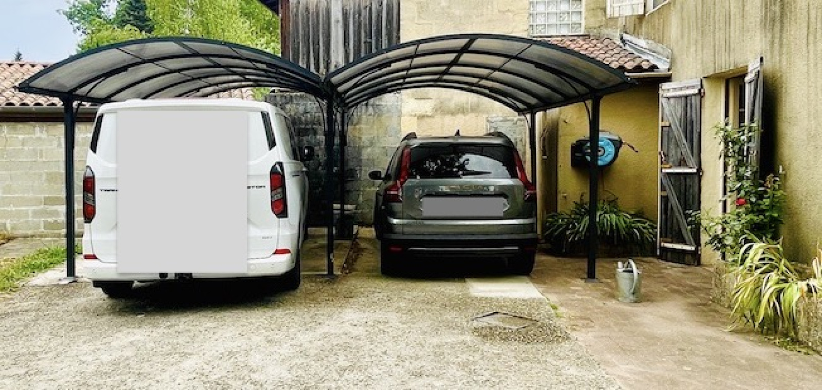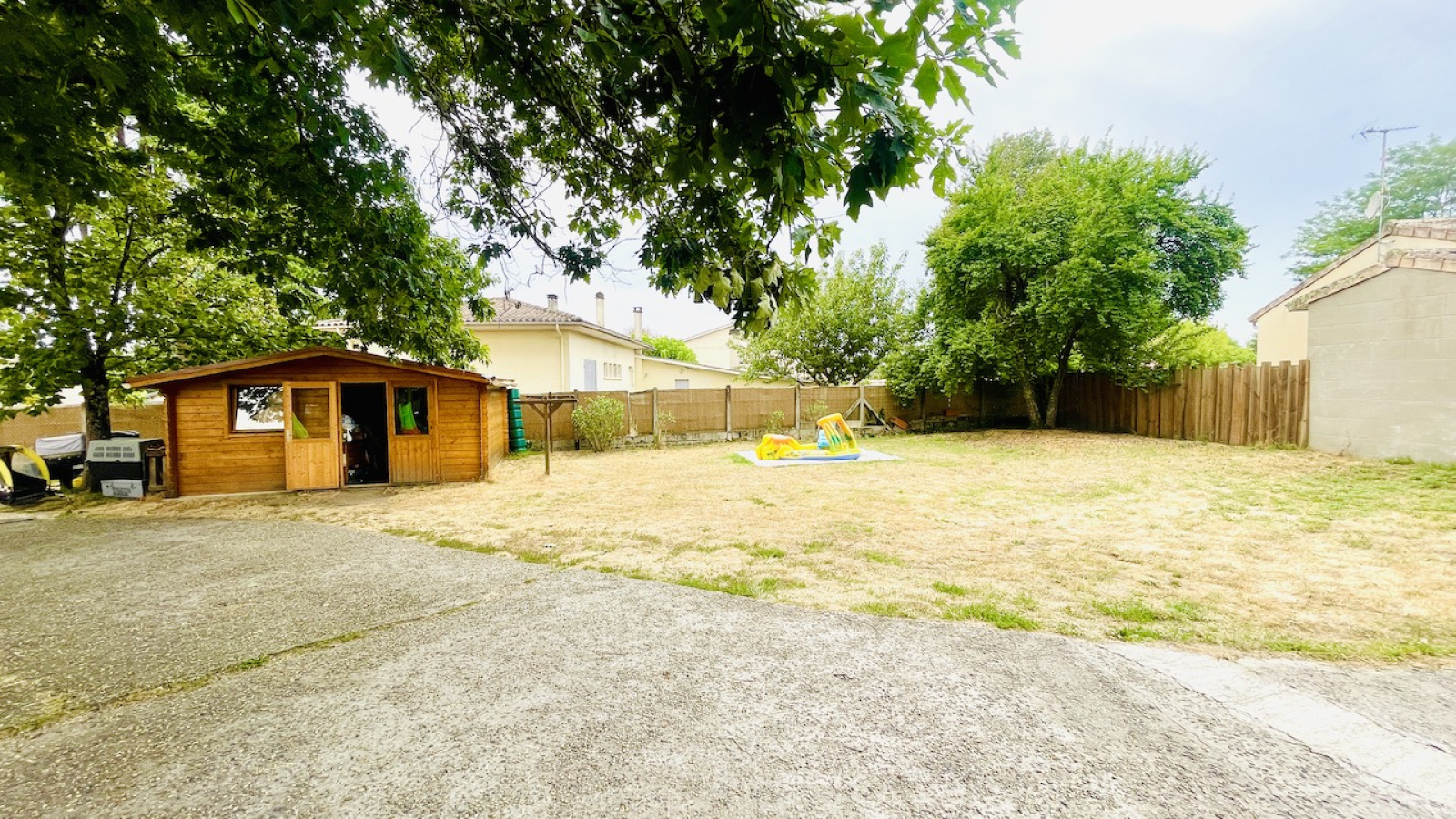A l'exterieur, une fois passé le portail electrique, on se gare sous le carport 2 voitures, l'outillage et les velos ont leur place dans le grand abri de jardin de 19m2 et on rejoint la terrasse à l'ombre d'un grand arbre pour les repas de famille. Un bel espace attend votre piscine.